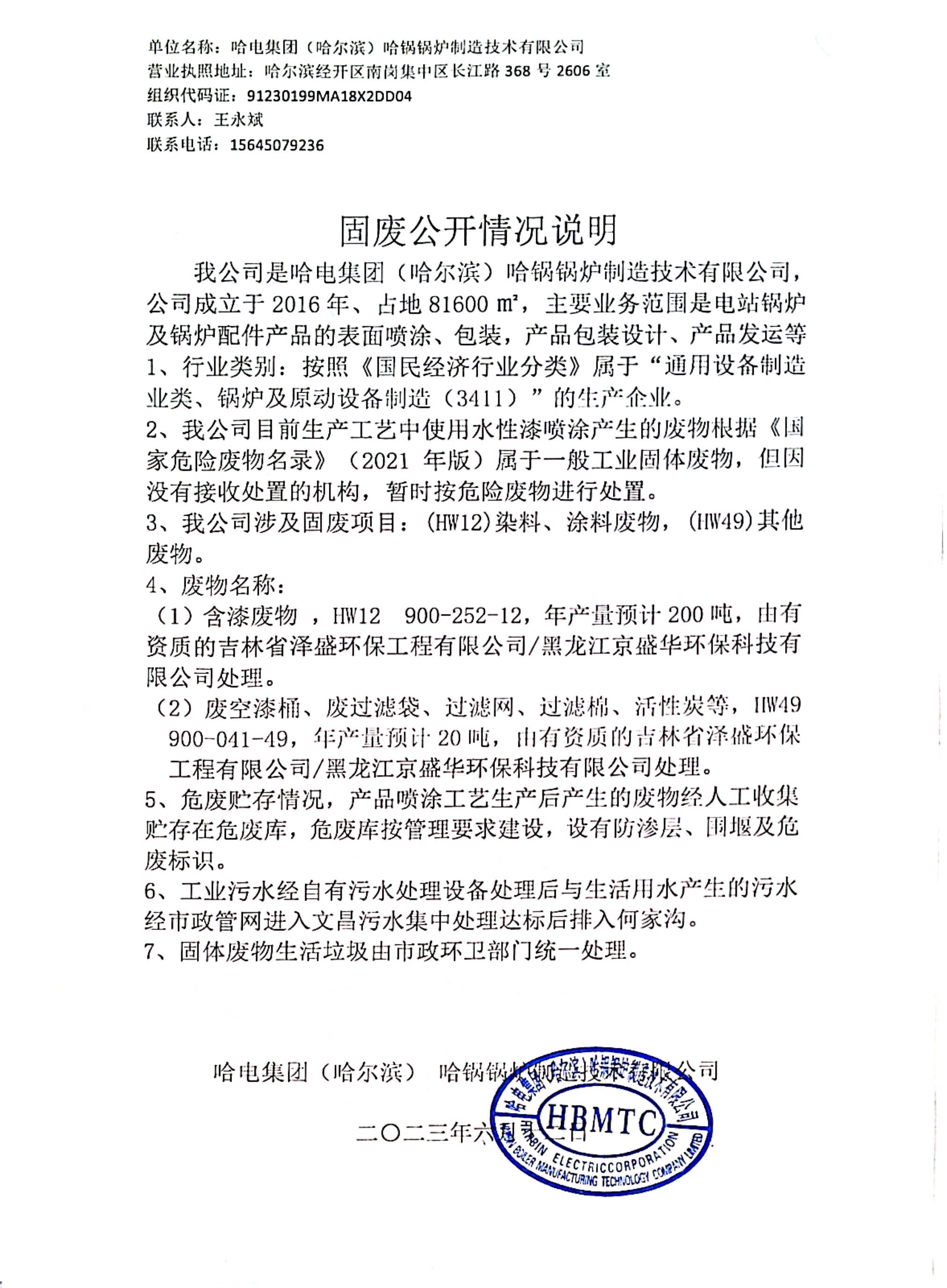 鍋爐制造技術公司2023年度固廢公開情況說明
