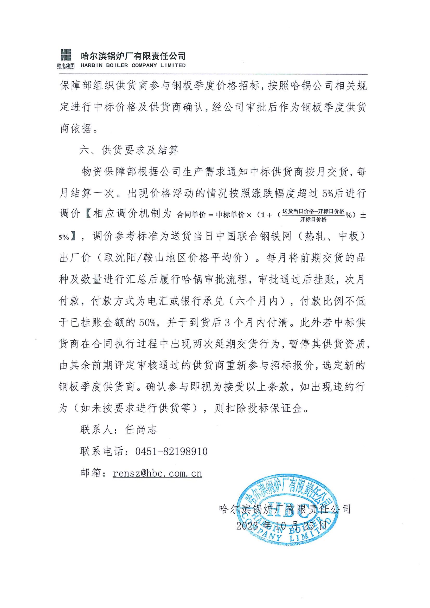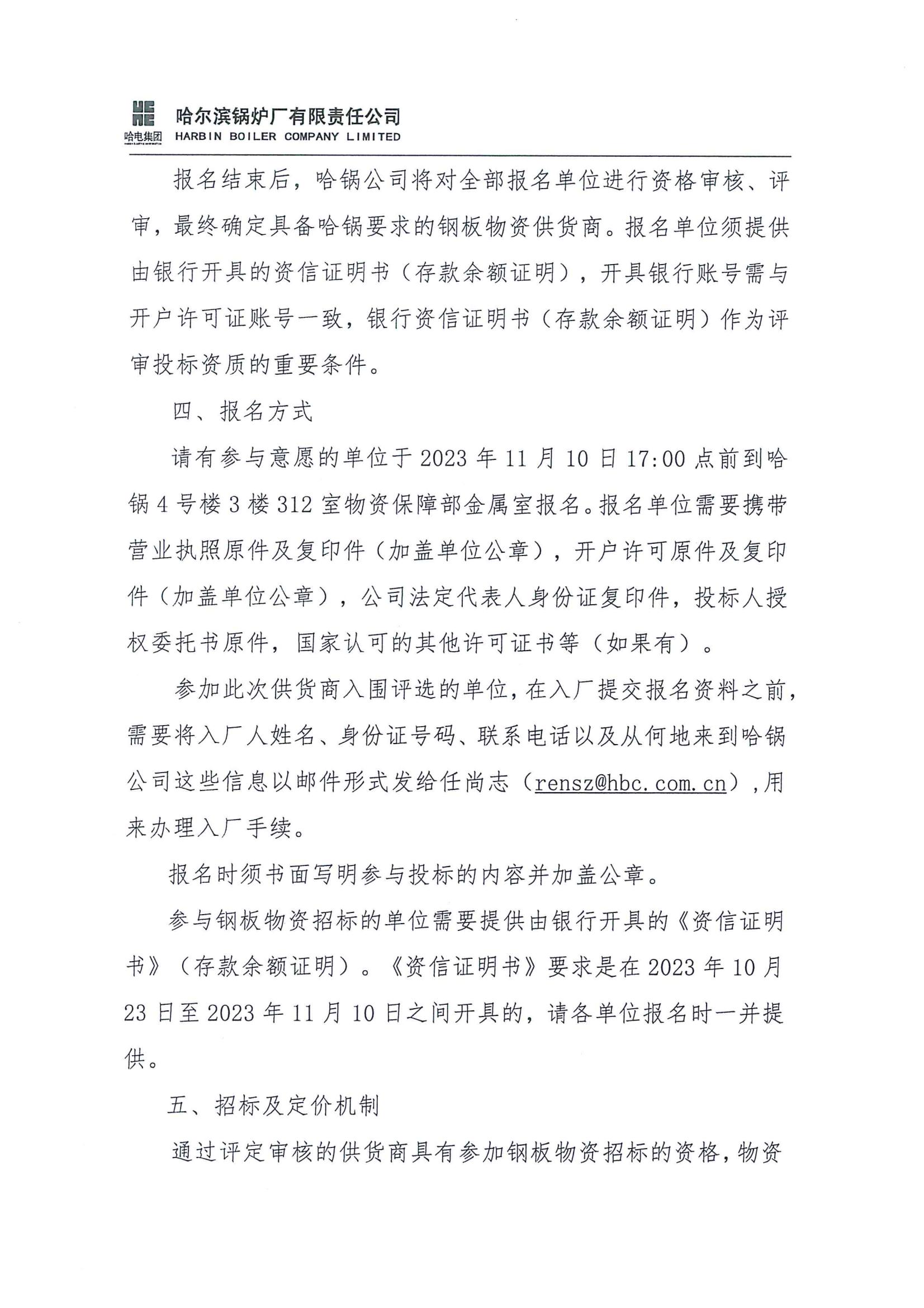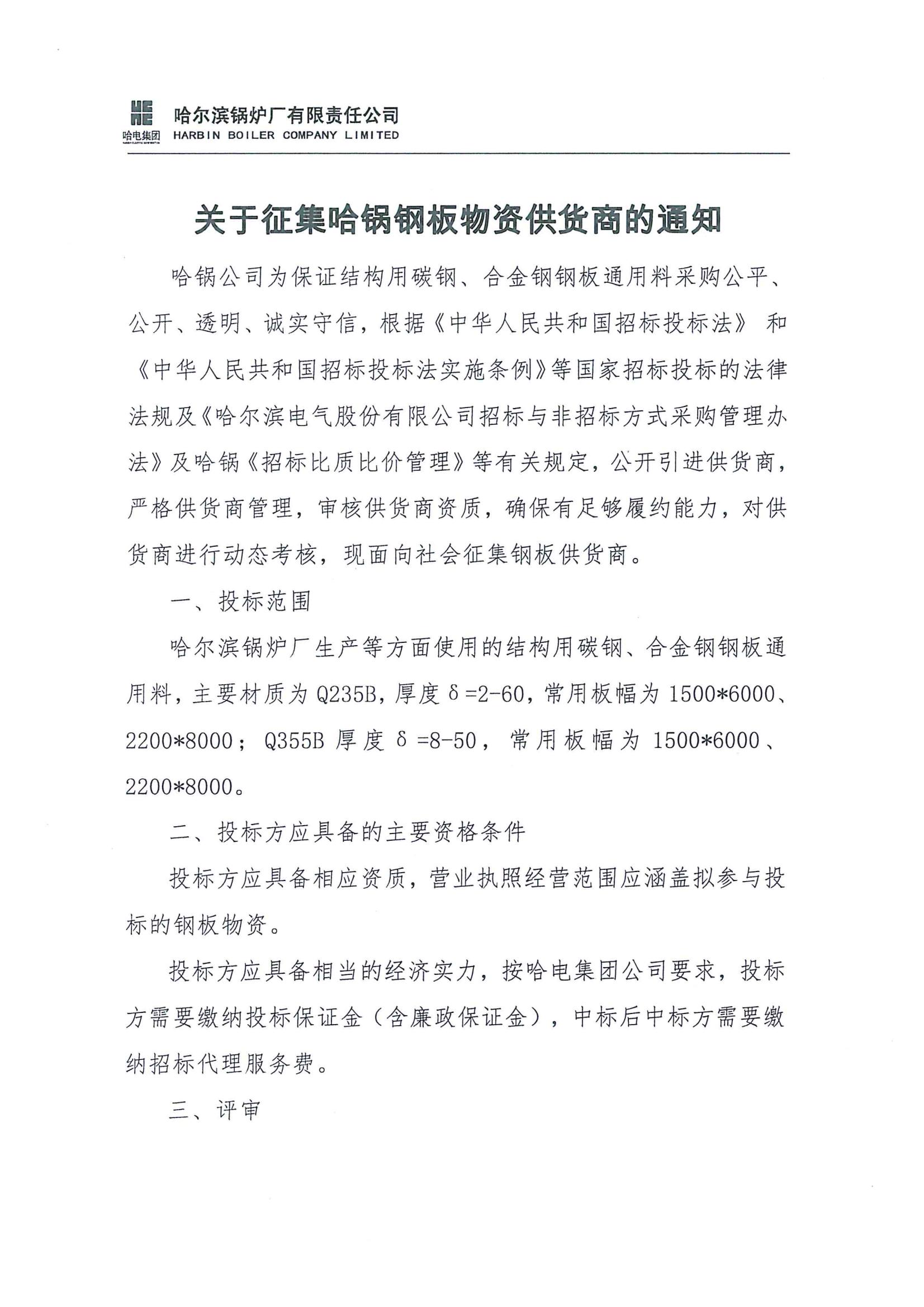 關(guān)于征集哈鍋鋼板物資供貨商的通知
