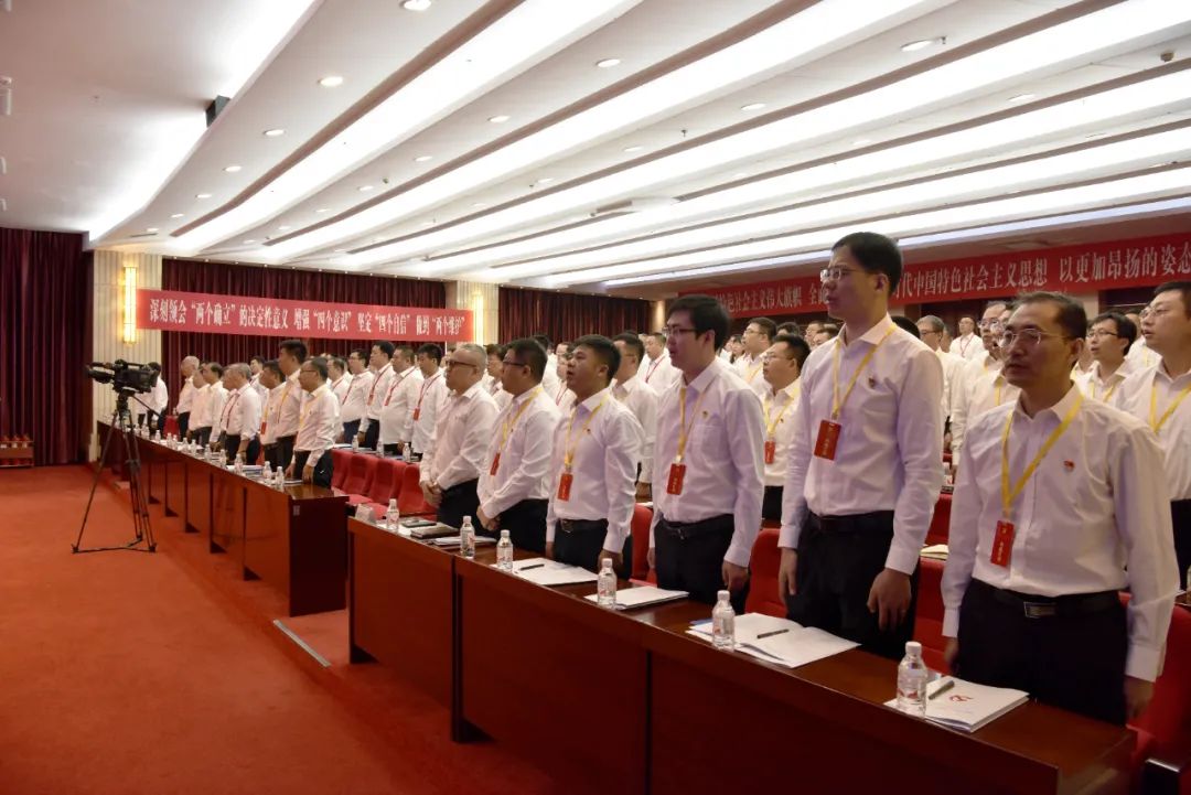 大會現(xiàn)場燈光璀璨,氣氛熱烈。主席臺后幕正中是熠熠生輝的黨徽,10面鮮艷的紅旗分列兩側(cè)。主席臺對面和兩側(cè)分別懸掛著“高舉中國特色社會主義偉大旗幟 全面貫徹習(xí)近平新時(shí)代中國特色社會主義思想 以更加昂揚(yáng)的姿態(tài)奮進(jìn)新征程、建功新時(shí)代”“深刻領(lǐng)會‘兩個(gè)確立’的決定性意義 增強(qiáng)‘四個(gè)意識’ 堅(jiān)定‘四個(gè)自信’ 做到‘兩個(gè)維護(hù)’”“學(xué)深悟透黨的創(chuàng)新理論 從黨的百年奮斗重大成就和歷史經(jīng)驗(yàn)中汲取奮進(jìn)力量”的橫幅。