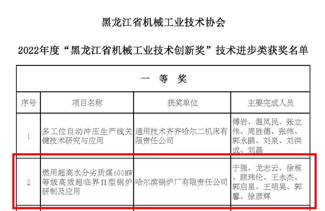日前,黑龍江省機械工業技術協會公布了2022年度“黑龍江省機械工業技術創新獎”技術進步類獎項獲獎名單,哈電鍋爐自主研制的“燃用超高水分劣質煤600MW等級高效超臨界Π型鍋爐研制及應用”項目獲得技術進步一等獎。
