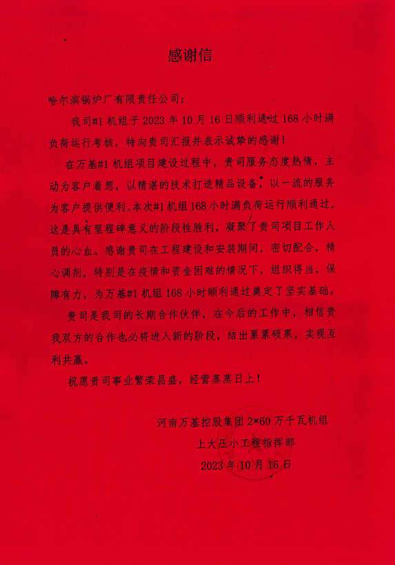 在河南萬基項目1號鍋爐設備投入商業運行之際,用戶專門發來感謝信,對哈電鍋爐提供的工作支持表示感謝,并表示希望繼續深化合作。